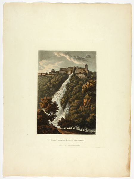 This print of "The Great Cascatella at Tivoli," was made by M. Dubourg sometime in the late 18th or early 19th century. The cool palette of blues and greens, combined with the cascading waterfall, evoke a sublime yet calming visual experience. Note how the composition of the artwork emphasizes a vertical orientation. The artist carefully uses line and form to guide our eyes from the top of the waterfall down through the rocky terrain, underscoring the power of nature. The visual structure—layered with the sky, trees, and water—creates a sense of depth, yet also confines the sublime within a structured, almost geometric frame. The print challenges conventional depictions of landscapes by playing with texture. The rough, uneven rendering of the rocks and foliage against the smooth, flowing water offers a dialogue between chaos and order. In doing so, Dubourg invites us to reconsider our relationship to the natural world, not as a passive observer, but as an active participant in deciphering its complexities.