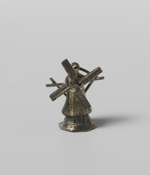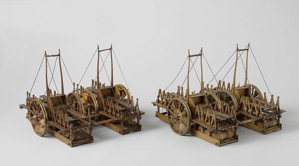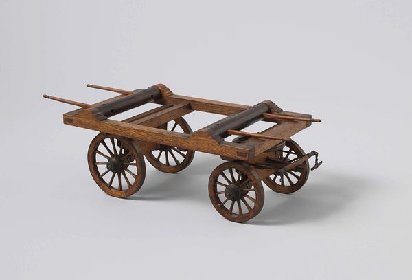 Curator: The stark beauty of this piece strikes me instantly. Editor: I see that, it does possess a minimalist charm, doesn’t it? We're looking at "Slijperswagen" or "Grinder's Cart," a metal sculpture crafted around 1822 by Gerrit Jan Ginnink. What’s capturing your imagination? Curator: There's a fragility, almost a longing. I can almost hear the faint whisper of the grinding wheel, like memories being sharpened against the dull ache of time. It reminds me of that feeling, after deep cleaning or doing an intense declutter when what used to be rough now feels sharp and new. Editor: Yes, I get that. This miniature encapsulates a moment of labor. Think about the artisan producing these types of carts – the societal structure inherent to workshops. What kind of life they had, day in and day out creating functional, yet, humble metal objects to assist the grinding worker? And that's without speaking of the grinders themselves. Curator: Exactly. Humble, yet it elevates this functional object. To create something with one’s own hands… it connects you. Editor: It highlights the quiet beauty in the ordinary and makes us think about the relationship of those making mundane object to the consumer—where's the value placed? Consider that metal objects during this era frequently came from industry towns that rapidly grew in size alongside advancements in material sciences. Curator: Perhaps this metal miniature is meant as a memorial, a delicate tribute to labor that's slowly fading. Editor: Or perhaps it’s a testament to human innovation – transforming raw materials into instruments of progress. How far can that transformative impulse take us, right? Curator: Yes, yes. Both those sentiments linger. And looking at it like this is quite... moving. Thanks. Editor: Thank you, a reminder of where things come from is always worthwhile.
