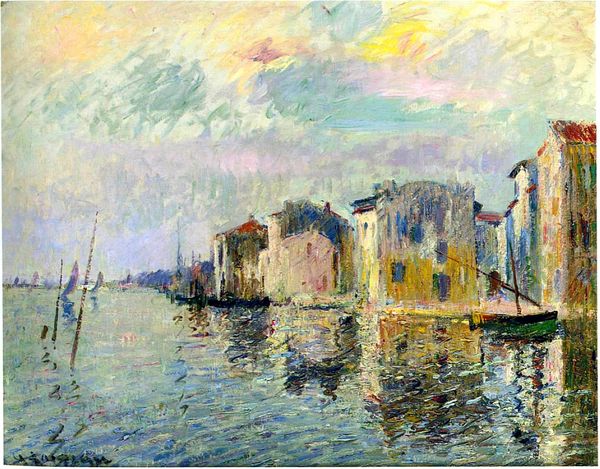 Editor: Here we have Denman Waldo Ross's "View of Canal with Gondola," an oil painting located at the Harvard Art Museums. The colors are so soft, almost like a faded postcard. What strikes you about this piece? Curator: It’s fascinating how Venice became such a popular subject for artists, solidifying its image as a romantic destination. Ross's painting continues that tradition. What do you think about the public perception and the artist's role in shaping how we see a city? Editor: That's a really good point. The way he painted it influences how we see Venice. Curator: Exactly! The very act of selecting this view, with its gondola and picturesque bridge, reinforces certain narratives about Venice. Perhaps we should consider whose Venice is being represented. Editor: I never thought about it that way. I'll definitely look at landscape paintings with a more critical eye now.