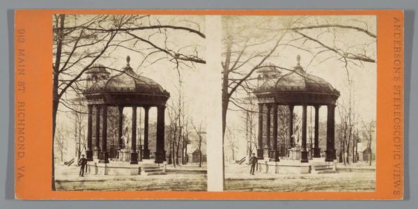 Editor: Here we have Florent Grau's photograph "Liefdestempel bij het Klein Trianon in de tuinen van Versailles," taken in 1859. The muted tones create a sort of ghostly scene of this classical structure. What strikes you most about it? Curator: The Love Temple itself, steeped in neoclassicism, becomes a symbol. Temples, throughout history, serve as physical manifestations of ideals. So, what is *this* temple declaring, with its Doric columns, its classical form presented to us? And how does this photograph contribute to or challenge our understanding of that declaration? Editor: So you're saying it’s not just about love, but about what love *means* in this specific context? Curator: Precisely. Neoclassicism in architecture often hearkens back to a perceived golden age, a return to rationality and order. The temple, therefore, doesn’t just symbolize love, but perhaps a desire for idealized, rational love, a concept born from intellectual aspirations rather than simply raw passion. Look at the careful composition of the image; does it communicate those ideals to you, and how? Editor: The framing, definitely, feels very deliberate, like it's trying to capture a perfect ideal. So the architecture informs the theme? Curator: Architecture *becomes* theme here, it expresses and almost contains that notion of love as this rational, perfected concept. The question then, perhaps, becomes what emotional weight do these historically-charged visual symbols possess? What did they represent then, versus what they may represent today? Editor: I never considered the loaded history within even a seemingly simple photograph of a building! Curator: Photography allows us to re-evaluate historical meaning in a modern era; it asks that we question not just what we see, but how that seeing has been shaped by layers of cultural memory. Hopefully you'll explore this perspective moving forward in your studies!