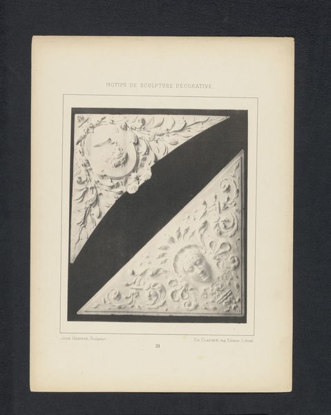 These triangular reliefs were sculpted by Jean Herman, likely from plaster, a material that allows for fine detail and easy reproduction. The crisp edges and smooth surfaces suggest they were cast, a process that would have allowed for multiple copies to be made efficiently. The designs themselves, featuring branches and a dragon, evoke a sense of classical ornamentation. The casting process speaks to a broader context of mass production and the desire to democratize access to decorative elements. These reliefs could have been incorporated into architectural settings, adding a touch of refinement to homes or public spaces. The dragon motif, with its intricate scales and dynamic pose, would have required considerable skill to model, even before casting. Ultimately, these reliefs bridge the gap between artisanal skill and industrial production, reflecting a moment when traditional craft techniques were being adapted to new technologies and social needs.
