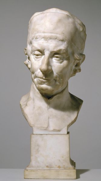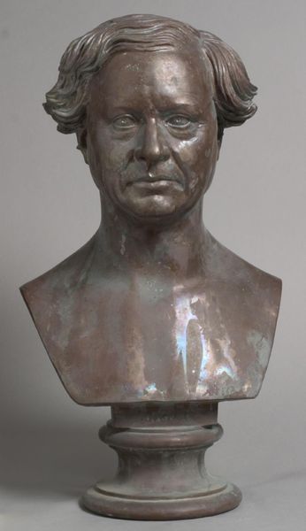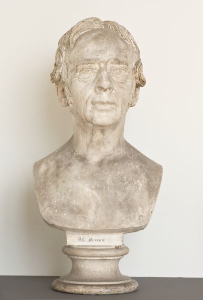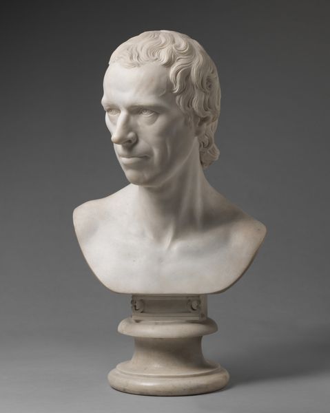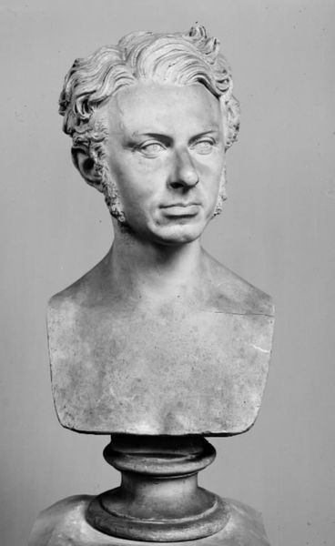 Curator: Here we have H.W. Bissen's sculpture of "Digteren Jens Baggesen," dating from 1863-1864. Editor: It possesses such a restrained and introspective quality, doesn't it? The cool, pale surface, the controlled curls… Curator: Absolutely. It's neoclassical in style, a testament to Bissen's dedication to classical realism. One can see the influence of the clean lines and idealized forms of antiquity. Originally made in plaster, though many marble versions exist, its production and the social context of portraiture in the 19th century are really crucial to appreciating this work. Portrait commissions solidified an artist’s reputation. Editor: Indeed, this reminds us how portraiture has long been a dialogue between visibility and memory. The meticulous rendering captures Baggesen’s likeness, but what about his character? How does Bissen use established symbolic codes? The tight, almost grim, set of his jaw seems like an intentional indicator of Baggesen's later years, fraught with mental illness. Curator: I'm curious about that too. Plaster itself is an interesting medium – readily accessible and easy to manipulate but ultimately, considered less precious than marble, therefore maybe communicating different levels of meaning contingent to value and class structures of the time? Was it simply more cost effective, given the demand for such pieces among a burgeoning middle class with a patriotic desire to monumentalize their cultural heroes? Editor: A fascinating question! I'm drawn to the way his gaze avoids direct engagement. What does this suggest about Baggesen’s reputation and inner world at the time? The Romantic poets grappled a lot with alienation from an increasingly industrial and secular society, which I think comes through. Curator: Well, certainly, Bissen's studio relied on multiple artisans to create these sculptures, indicating division of labor typical for its time. These kinds of details should provoke discussions about production and challenge the singular attribution of artistic genius that traditionally prevails, no? Editor: An important aspect of studying Neoclassical works! For me, it brings into focus the continuing relevance of Jens Baggesen as an emblem, though tinged with melancholy and psychological depth. Curator: Agreed. Seeing it through a lens of materiality adds a layer of complexity, reminding us of art’s connection to industrial advancements and to its economic impact at a time of burgeoning cultural identity. Editor: Precisely. The image then is laden with even greater cultural significance, an echo resonating even now.