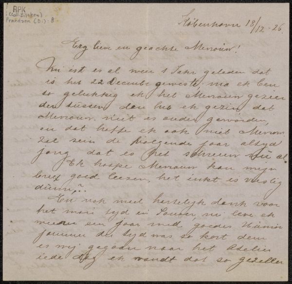 This is a postcard to Jan Veth, handwritten by Willem Kloos in Amsterdam, dated June 10, 1886. It provides us with a glimpse into the Dutch literary scene during a period of artistic and intellectual ferment. Kloos, a leading figure of the "Tachtigers" movement, corresponds with Veth, likely concerning literary matters and addressing a misunderstanding about an address. The Tachtigers, or the Eighties Movement, sought to revive Dutch literature by rejecting traditional forms and embracing individualism and aestheticism. Their revolt took place within a complex web of institutions, journals and patronage. Consider the social conditions that fostered such movements. In a rapidly modernizing Netherlands, artists sought new forms of expression. The rise of literary journals provided platforms for debate. The politics of imagery, the social conditions, and the cultural movements are all essential to understanding this seemingly simple postcard and the art that emerged from this context. To delve deeper, one might explore archival collections of letters and literary journals. The meaning of this postcard, like any artwork, lies in its relationship to its social and institutional context.
