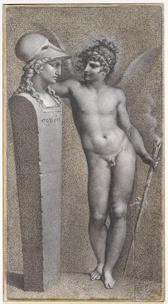 Curator: Anne-Louis Girodet's charcoal drawing, Pygmalion and Galatea, created around 1808, offers us a fascinating glimpse into Neoclassical interpretations of classical myth. What strikes you immediately about this piece? Editor: There's a striking stillness. Despite the dynamism of the subject – a sculpture coming to life – the overall impression is one of serene composure. The muted tones enhance that effect, contributing to the sense of restrained elegance, so typical of Neoclassicism. Curator: Indeed. And that stillness belies the quite revolutionary act taking place. Girodet’s approach, while formally quite academic, invites contemplation of societal constructs around creation and female agency. Pygmalion, a sculptor, creates a woman to his liking, embodying the male gaze's power over the female form. Editor: Absolutely. You can see Girodet meticulously employs line to define form and texture. Observe the contrasted textures: the smooth, idealized skin of Galatea against the drapery's flowing folds and Pygmalion's own rougher, almost frenzied rendering. It underscores that tension. Curator: Considering this piece was crafted during a time of upheaval with the rise and fall of Napoleon, one can interpret Pygmalion's act as a parallel to the creator imposing order, his own vision of beauty, onto a chaotic world, and perhaps controlling the destiny. Girodet seems to be interrogating who has the right to impose their ideal upon the other. Even little Cupid clinging to his leg, seemingly ready to encourage these actions. Editor: Yes, there’s a psychological charge beneath its surface, created using strictly formal choices of composition and contrasts, particularly in his unusual approach with shadow in a drawing—an innovation that marks Girodet's importance during this time. Curator: Seeing how the themes in this early 19th-century work about controlling image and creation of others is still very alive within art now, just goes to show you can look back and also consider the present day's narratives. Editor: Agreed; analyzing those choices, and considering its lines and tone help us appreciate it anew.