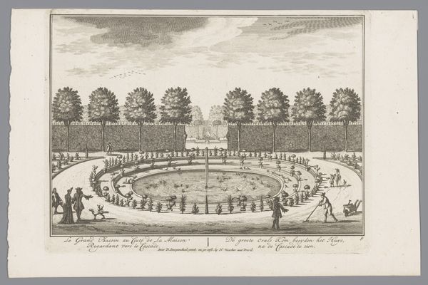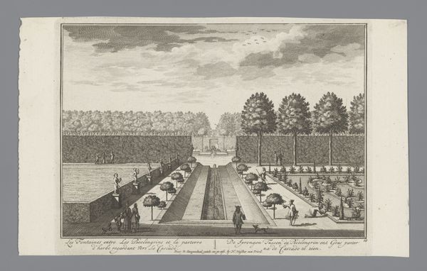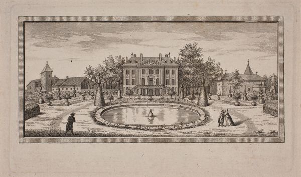 Curator: Immediately striking is the formality and regimentation within what should be a landscape. Editor: This is "Vue perspective du Chateau de Bregentved" by W.A. Müller, dating from 1763. The print utilizes etching and engraving. Notice how Müller directs our gaze along that meticulously planned central axis. Curator: Planned indeed! I’m drawn to consider the immense labor required to produce this landscape, moving earth, cultivating precise geometries. We're not seeing nature, we are seeing labor and the production of status on a grand scale. Editor: Precisely! And status intertwined with power. The architecture, the landscape design…it’s all communicating social hierarchy, right? This image, created through printing techniques, itself is testament to labor: someone had to etch and engrave the plate. These details were printed and likely circulated widely. Curator: Look at the detail in the coach and horses… that surely speaks to consumption and transportation. And there's the question of accessibility. Who gets to witness this idealized estate firsthand, and who only views it as mediated through prints like this? The act of viewing itself reinforces class divisions. Editor: Absolutely, and thinking about accessibility, prints like this help construct and perpetuate a certain idea of aristocratic life. It normalizes the visual of wealth, connecting it to notions of enlightenment and sophistication. What does it mean for the labor that sustains such imagery, though? Is it acknowledged, or obscured? Curator: I wonder if we should delve deeper into Müller’s choice of technique? Etching allows for a certain freedom of line, but engraving is incredibly precise and demanding, this image relies on both... Editor: I think it serves to elevate the scene further, presenting it as both refined and grand. A testament to status through labor in the fields and in artmaking itself. Curator: It’s fascinating how a landscape can be so thoroughly constructed to serve as a marker of societal structure. Editor: It speaks volumes about the values of the time, wouldn't you agree? Thank you for giving insight on the print and the ways in which it makes one think about wealth, artmaking, and social classes.