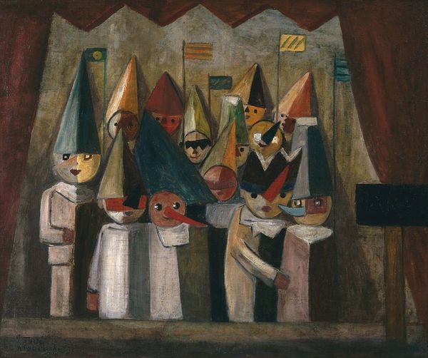 Curator: Let’s turn our attention now to “Praying Chefs”, an oil painting by William Balthazar Rose. Its exact date remains unknown, leaving room for interpretive speculation. Editor: Immediately, the painting's odd figuration and unsettling composition create a somewhat carnival-esque mood—figures wear masks and seem to partake in strange rituals. Curator: Note the subdued palette, rendered with thick impasto. Consider, also, how Rose arranges the figures. There are, indeed, two chefs—presumably the "praying chefs"—in the center, flanked by characters in costume, one on horseback and another wearing a conical mask. Editor: This figuration seems both deeply playful and intensely self-conscious. But what kind of social performance are we seeing here? Given the visible brushwork, could we perhaps think of it as an intentional rejection of conventional polish? Curator: Rose masterfully exploits texture. The varying paint application is strategic and clearly designed to subtly separate the background and foreground elements. The eye bounces across a carefully organized composition; our sight moves constantly. Editor: Perhaps the prayer is tied to the labour of cooking, offering thanks or seeking guidance, while the other figures represent outside influences that permeate or dictate even domestic spaces. Perhaps they’re actors who seek to add layers to a pre-written meal, just like Rose’s painterly gestures give the impression of having being improvised as he added layers on canvas. Curator: A rich tapestry of symbolism indeed. The figures draw our focus inward and give way to various theoretical interpretations and cultural contexts. Editor: Yes. Examining it this way, the art challenges high and low art distinction. Instead, Rose invites us to consider labour, materials, and consumption. It is a stimulating piece that pushes our definitions of art history.