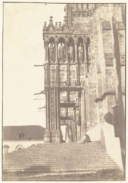 Curator: This daguerreotype by Charles Clifford, titled “Portaal van de kathedraal van Avila,” dates to sometime between 1850 and 1863. Its subdued tonality really captures my eye, as does the incredible detail on that cathedral portal. What's your initial take? Editor: Austere. Absolutely austere. It reminds me of an old fortress or some bastion against the darkness, captured right before dawn. All stone and shadows, almost melancholic. Curator: Precisely! And consider how Clifford frames the portal head-on. This compositional decision underscores the symmetry and ornate detailing of the gothic architecture, allowing us to dissect it formally, layer by intricate layer, which directs one's gaze upwards. Editor: Mmm, I appreciate the rigorous formalism, truly! But for me, that unflinching perspective makes me consider how it represents history, or, rather, the photographer’s attempt to freeze time, a bygone era represented through sheer monumentality. And, look closely at the tiny figures at the portal base, they feel utterly insignificant. Curator: Good eye. Indeed, note how Clifford exploits the tonal range of the daguerreotype process. The deep shadows and subtle highlights create a stark contrast, emphasizing the solidity of the stone and the depth of the carvings. It is not only representational, but materially aware of its strengths. Editor: That's very astute, as I can appreciate the detail afforded in the carvings and stone textures. I just wish there was a little less weight…perhaps a bird or something breaking the severity of the composition, injecting some joy! Curator: Clifford here isn’t presenting an escape. The image engages in an architectural portraiture which invites consideration of structure. Editor: I see that! It makes you question scale and eternity…so in the end I come away a believer. Curator: Then perhaps Clifford's precise vision achieved its objective, wouldn't you agree? Editor: Undoubtedly. A moment, beautifully and monumentally captured.