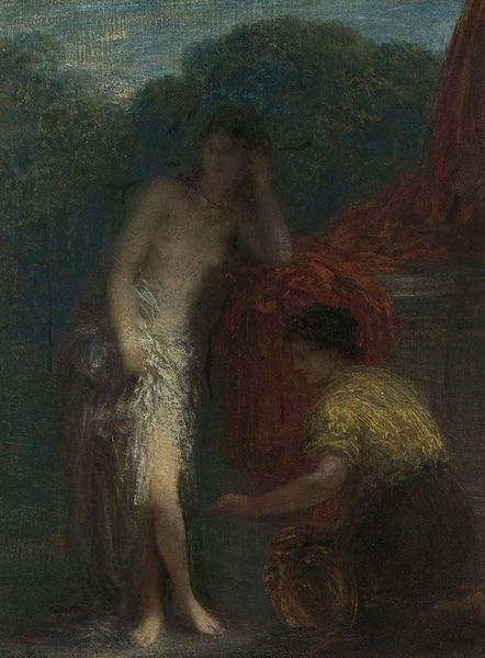 Henri Fantin-Latour made this oil painting, titled ‘Le Lever’, sometime in the 19th century. Fantin-Latour builds up layers of thinned oil paint, a process called glazing, to create a luminous effect, particularly evident in the woman’s skin. The artist’s quick, loose brushstrokes define the forms, a stark contrast to the smooth surfaces often seen in academic paintings of the time. This method allows for a certain ambiguity, blurring the lines between the figures and their surroundings. This method of painting reflects broader trends in society. Oil paint, readily available thanks to industrial production, enabled artists like Fantin-Latour to experiment freely. His departure from traditional techniques also suggests a shift in artistic values, favoring individual expression and direct engagement with the material, in defiance of established norms. Ultimately, this work reminds us that the way an artwork is made is just as important as what it depicts. Fantin-Latour’s choice of materials and techniques places him squarely within a network of innovation, and emerging ideas about artistic freedom.