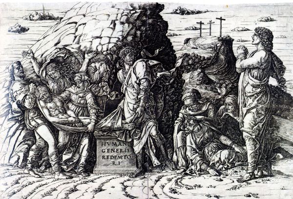 Andrea Mantegna's "The Entombment", made with burin and engraving, captures a pivotal moment laden with grief and religious significance. Executed during the Italian Renaissance, a period marked by humanist ideals and artistic innovation, this print reflects the era's profound engagement with classical art and its emphasis on human emotion. The scene unfolds with raw emotion, focusing on the intimate act of preparing Christ's body for burial. Look at the women huddled together, their faces etched with sorrow. They are mourning the loss of their social leader. Mantegna masterfully uses line work to create depth and texture, enhancing the drama of the scene. The three crosses in the background serve as a stark reminder of the events that have just unfolded. Mantegna's choice to depict this subject matter through printmaking would have allowed for wider dissemination, thus extending its emotional reach. The artist offers not only a religious statement, but also a profound meditation on loss, memory, and the human condition.