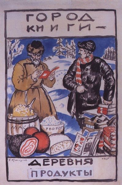 Boris Kustodiev made this poster, "Leningrad Society bows town and country", to show the connection between city and country. You can see it in the brushwork and the way he's laid down the colours – everything feels immediate and kind of raw. I like how the figures almost seem to be emerging from the snowy ground, painted with a casual directness, creating a sense of unity. The colours are muted, which gives the poster a serious, down-to-earth feel. The man on the left, with his fur hat, is offering a newspaper to the younger man who is coming from the city with books. There's something touching about it, like they're building a bridge of knowledge and exchange. The image is also beautifully stylized, which gives it an iconic quality. It reminds me a little of the early Soviet avant-garde artists, who were also trying to find new ways to connect art and life. Ultimately, though, it’s a reminder that art is a conversation, constantly evolving and drawing on the past to create something new.
