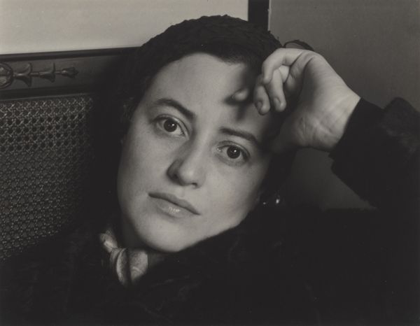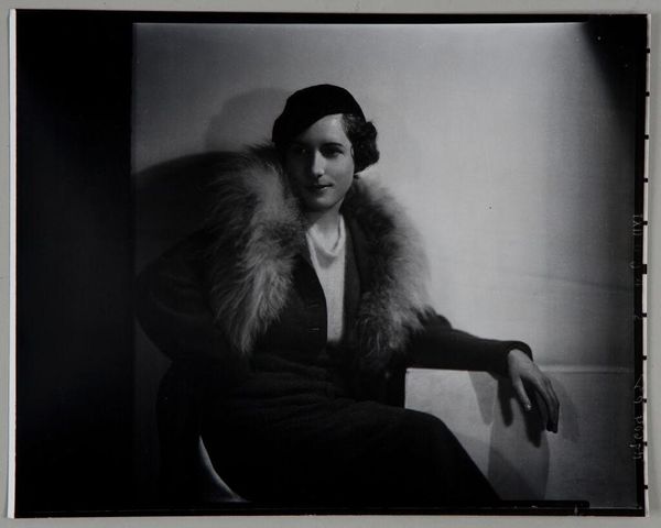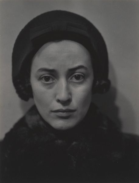 Editor: Here we have Alfred Stieglitz’s gelatin-silver print, "Dorothy Norman," from 1936. The strong contrast between light and shadow gives it such a dramatic feel. What strikes you about this portrait? Curator: The materiality interests me. Consider the gelatin-silver process itself, a mass-produced technology enabling a specific aesthetic, distinct from earlier photographic processes. It also places it firmly within an industrialized culture. Notice how Stieglitz has carefully manipulated the light. Why do you think he chose to expose Dorothy Norman like that? Editor: Perhaps he was highlighting certain aspects of her personality or status? The stark light draws my eyes directly to her face, and also showcases the texture of her coat. Curator: Precisely. Look closely at the herringbone fabric. That pattern speaks of textiles, labour, and even commodity culture of the time. Consider the resources necessary to produce it. And don't ignore that she and Stieglitz later had a deep friendship and that their professional relationship furthered Norman's own artistic career. How does thinking about that power dynamic affect your perception of the image? Editor: That’s fascinating! Knowing about their relationship makes me question the nature of the portrait even further. Was it about elevating Norman or simply a formal experiment playing with class? Curator: Both, potentially. By understanding the socio-economic implications inherent within the materials and the relationship dynamic, we unveil layered meaning in the print, not merely a record, but a social document. Editor: I never thought about portraits this way. Considering the labour and social context has really changed how I see the piece. Curator: Indeed. It’s crucial to move past mere visual appreciation and examine the structures and labour inherent within a work to grasp a fuller meaning.