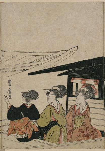 Editor: This is "Boaters Watching a Fight" by Utagawa Toyohiro. I’m struck by how calm the figures seem given the title. How do you interpret this work within its historical context? Curator: Woodblock prints like this gained popularity as they made art accessible to a broader audience. Notice how the women are observing the fight from a safe, almost theatrical, distance. Does this suggest anything to you about the role of women in public life at the time? Editor: Perhaps they are spectators, removed from the actual conflict, suggesting a passive role? Curator: Precisely. The print may subtly comment on social hierarchies and gender roles in Edo-period Japan, where such public displays of conflict were often observed, and sometimes even enjoyed, by those in a position of privilege. Editor: That's a perspective I hadn't considered. It’s fascinating how a seemingly simple scene can reflect deeper societal structures. Curator: Indeed. Art often serves as a mirror, reflecting and sometimes subtly critiquing the society that produces it.