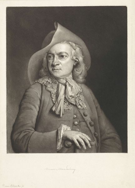 This stipple engraving rendering a portrait of Willem George Frederik van Oranje-Nassau was created by Valentine Green in 1787. The subject is depicted in neutral tones that lend a softness to his features. The sharp contrast in the dark background emphasizes the smooth texture of his face, directing the viewer's eye to his gaze. The composition relies on a formal structure, with the subject centrally positioned. The artist engages with prevailing notions of representation and power. The sitter's gaze meets the viewer's, seemingly acknowledging the act of being observed, and creating a visual discourse around visibility, authority, and the construction of identity through portraiture. The texture achieved through stippling softens the image but also serves to subtly destabilize the notion of a fixed, singular representation. This engraving thus becomes an exploration of seeing and being seen, challenging us to consider the complex interplay between representation, power, and identity.