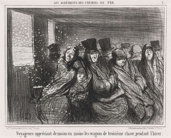 Curator: Daumier's lithograph, "Travelers Enjoying a Third-Class Carriage Less and Less in Winter," depicts the stark realities of 19th-century rail travel. It's currently housed at the Harvard Art Museums. Editor: The desaturated tones really amplify the bleakness. It’s a cramped space filled with weary faces, each etched with a quiet suffering. Curator: Absolutely. Daumier was known for his social commentary. He highlights the inequities of class through the experience of these travelers. Editor: You can almost feel the chill in the air, a shared hardship cutting across age and perhaps even social standing, if only for the duration of this journey. There’s a profound sense of shared humanity here. Curator: Indeed. This work is a reminder that art can serve as a powerful lens through which we examine societal structures. Editor: A somber, yet deeply resonant reminder, especially when considering contemporary mobility and social justice.