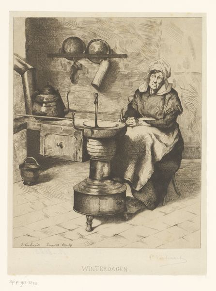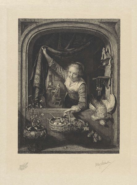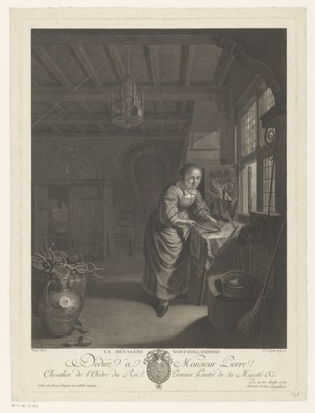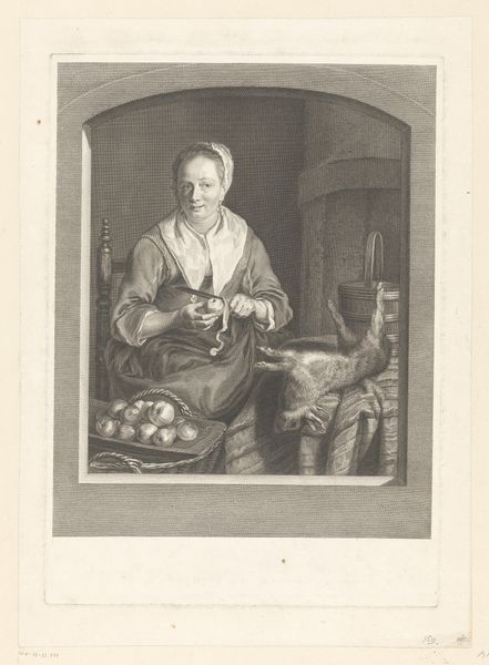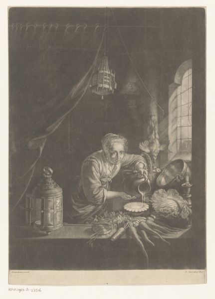 Pierre Etienne Moitte made this print, *Keukeninterieur met keukenmeid*, using engraving, a process where lines are incised into a metal plate, which is then inked and printed. Moitte’s choice of engraving to depict a kitchen interior is significant. Engraving, with its capacity for detailed linework, mirrors the meticulous labor of the kitchen maid. Look closely, and you'll notice the textures of the wooden buckets and metal pots. Moitte’s engraving captures the weight and feel of everyday objects, raising the status of laboring class objects to fine art. The scene itself invites consideration of the amount of work involved in food preparation and service, as well as the architecture of the kitchen which would have been designed for an army of staff performing manual labour. By focusing on the processes and materials of both the depicted kitchen and the engraving itself, we begin to see how Moitte elevates the ordinary to the extraordinary, challenging traditional distinctions between fine art and craft.
