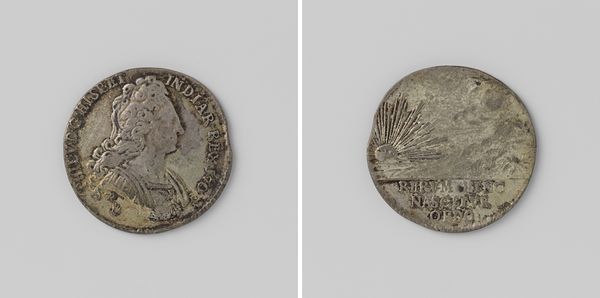 Curator: Look at the patina! It lends such an ethereal quality to this double-sided metal relief currently housed at the Rijksmuseum. The piece dates back to 1582 and portrays "Francois, hertog van Anjou en Alençon." What are your initial thoughts? Editor: It's... muted. There's an almost haunting pallor to the metal that impacts the figures depicted. Even though it is sculpture, it feels two-dimensional. What historical narratives are enmeshed within this medallion? Curator: As a tangible object circulated amongst elites, it represented and performed Anjou's political aspirations. Note how the relief presents a stoic, almost detached profile, fitting the codes of masculinity during this era. One side shows his visage, and the other features a landscape dominated by a radiant sun rising over water. Editor: Yes, I observe a sunrise or perhaps a beacon, situated just above what looks like turbulent waves, contained within the disc's circumference. Semiotically, that contrast jumps out: the turmoil of water versus the beaming light. This could symbolize the volatile political climate in which Anjou was attempting to shine. Curator: Precisely! And that volatile climate was very fraught. As Duke of Anjou, he sought sovereignty over the Netherlands during a time of intense religious and political conflict. Consider, too, how these portrait medals functioned to propagate power and shape public perception. What does this small object communicate about cultural norms and sociopolitical anxieties during the late Renaissance? How do you see its symbolism resonating across identities? Editor: Beyond Anjou’s historical and personal context, light’s persistent motif creates a sense of dramatic tension. Consider how the circular format interacts with both subjects represented in relief—one the Duke’s profile and the other the powerful symbolism. The artist masterfully works in such confined space, framing those tiny allegories within broader political dimensions. Curator: This medal offers a glimpse into Anjou’s attempts to construct a regal, near mythical persona amidst great turmoil, reminding us that even small artifacts bear complex meanings about larger narratives. Editor: Yes, indeed, there are broader significations; while simultaneously demonstrating remarkable artistry within a limited scale and space, it still speaks to themes both political and personal.