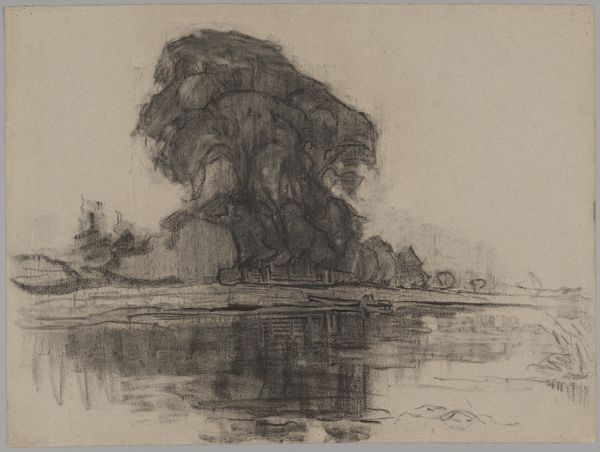 This landscape with tall trees was made by Maurits van der Valk using pen and brush in grey ink. The immediate impression is one of tonal balance, but with marked verticals from the closely grouped trees disrupting an otherwise horizontal composition of land, water and sky. The trees dominate, their solid forms contrasted by the soft washes of the sky. This interplay between line and wash suggests a concern with the structure of the landscape, as much as its appearance. Van der Valk's use of a monochromatic palette brings emphasis to the composition. The visual elements are reduced to their most basic forms, creating a study in contrasts: light and dark, solid and void, vertical and horizontal. The artist seems less interested in depicting a specific location, and more in exploring the underlying structure of landscapes. This approach aligns with the formalist tradition, where the emphasis is on the visual elements and their arrangement, rather than any external narrative. Each viewer is invited to find new meanings in the artwork.