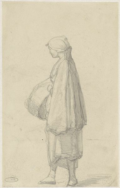 Willem Albertus Haanebrink made this drawing of a standing woman with a basket in her arm using graphite, and the soft delicate markings of this drawing create a reflective and serene atmosphere. The figure is depicted from behind, her posture and the way the light falls across her body suggests a subtle narrative. The artist uses the interplay between light and shadow to create form and depth. The structural arrangement of the drawing, with the figure positioned centrally and the landscape providing a muted backdrop, invites the viewer to consider the relationship between the individual and the setting. Note how the use of line and tone, rather than color, heightens the sense of contemplative distance. Haanebrink prompts an ongoing dialogue about representation, perception, and the subtleties of human experience, reminding us that art is continually re-evaluated through changing perspectives and cultural contexts.