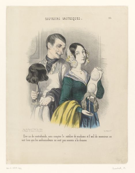 Curator: Looking at this lithograph from around 1897-1900, an advertising poster for the publisher Ch. Eggimann et Cie in Geneva, I'm struck by its blend of old and new. Editor: It certainly captures a certain fin-de-siècle elegance, but I am also taken by the very tangible contrast between the almost aggressively fashionable woman and the somewhat dowdy one beside her. They’re almost confrontational, like a ‘before’ and ‘after’. Curator: Precisely. This poster is fascinating as a material object. As a lithograph, a relatively new printmaking technique at the time, it allowed for mass production, making art accessible to a wider audience through advertisement. The paper, the inks, the very process… they democratize culture. Editor: And of course, it functioned within a very specific economic and social framework. Think about where it would have been displayed - likely plastered on walls, competing for attention in a bustling urban environment. Who were the intended viewers, and how did the imagery of fashionable modernity combined with traditional local dress appeal to them? This represents a very conscious targeting of audiences in Geneva, wouldn’t you agree? Curator: Absolutely. And consider the social history encoded within. We have here not just an advertisement but an image reflecting evolving class structures, emerging consumer culture, and how women were both represented and engaged as consumers of literature. Also notice the long list of forthcoming books on various subjects. Editor: Yes, this poster encapsulates both an artistic moment and an early marketing strategy: a sign of the times when posters invaded public spaces, contributing significantly to visual culture. It’s worth pondering how such advertising impacts cultural institutions, public behaviors, and urban environments—things to keep in mind today. Curator: Indeed, looking at this piece I am drawn back to a time of great flux and reminds me that “art” and "commerce" need not be considered wholly independent, rather art helps to sustain a healthy business.