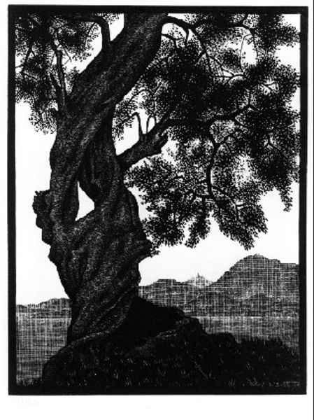 Editor: This is M.C. Escher's "Carubba Tree (February 1932)," a landscape print in ink from 1932. I find the high contrast really striking; the tree itself is incredibly detailed compared to the almost hazy background. What is your initial reaction? Curator: I observe the dominance of formal geometry as the foundational structure. The solid tree versus soft distant landscape presents a dichotomy between the clear and precise foreground with a progressive blurring, suggesting a semiotic game with near/far representations. Do you perceive this? Editor: I see the contrast you mean, almost like different styles mashed together. How does the geometry inform the whole, if that makes sense? Curator: Notice the geometric rendering of the rock, almost like crystalline facets. That exactitude spreads out to define the image—the contrast of dark versus light that organizes Escher’s whole composition and directs the viewer’s eye to specific points of high definition within a larger pattern of shapes and values. Editor: So it is less about representing a landscape, and more about arranging a balanced composition with contrasting details? Curator: Precisely. We are invited to analyze Escher's precise arrangements. The print asks the viewer to perceive the overall aesthetic effects achieved, while disregarding subject. Editor: That’s so interesting. I definitely came in with a representational bias and completely missed the formal composition. Curator: Indeed. The artwork can prompt such explorations into its very nature of production when considering a Formalist approach.