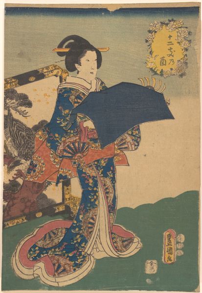 Curator: This print, simply titled "Print," comes to us from the hand of Utagawa Kunisada, crafted sometime between 1786 and 1854. Editor: My first thought is of the surface—a very considered and subtle arrangement of texture through both the materiality and process. There's an unexpected stillness, given the visual detail. Curator: Indeed, and a large part of that is its masterful composition. Kunisada leverages both color and pattern to construct a visual space that feels both intimate and expansive. The patterning, particularly on the Kimono, has an interesting symbolic structure. Editor: Agreed. Beyond the visual design, look closely at how these woodblock prints were actually made. The hand of many artisans would have been on each print—consider the material processes and labour required for an edition of prints of this nature. It raises questions about access and the distribution of these kinds of works. Curator: It's intriguing to consider the context in which this work would have been consumed—who would have seen it and what meaning would it have held for them. Is it a window into an older, maybe idealized society and culture? How can we read this work through a formal analysis of pictorial space? Editor: The materiality and craftsmanship allow for that consideration. The texture of the paper, the specific ink used for the linework...these aren't accidental; they speak to artistic intentions, but also to social hierarchies within artistic production itself. This work seems both precious and mundane at once. Curator: Perhaps this contrast captures an essential element of Ukiyo-e: the blending of everyday life and art. It pushes back against rigid distinctions between the popular and elevated art traditions, while exploring ideas through structure. Editor: And challenges our assumptions about fine art traditions, the labor inherent in "high art," and consumption as an active dialogue—material to object to viewer, and back again. Curator: The interplay you suggest offers avenues into interrogating those historical conditions, how the structure supports different potential interpretations. Editor: Precisely, these material processes reveal and reify these power structures, creating new ones as they engage viewers and shift across contexts and eras. The artist, through the material of choice and labour in their execution, builds into something new for an active present.