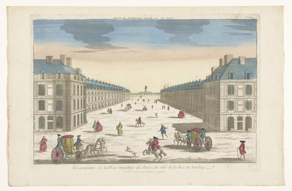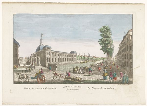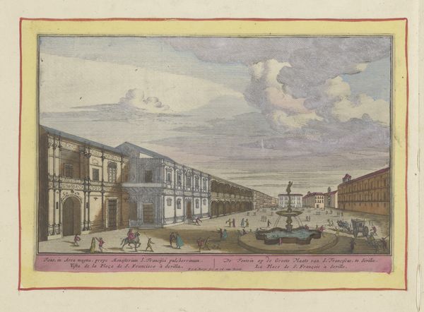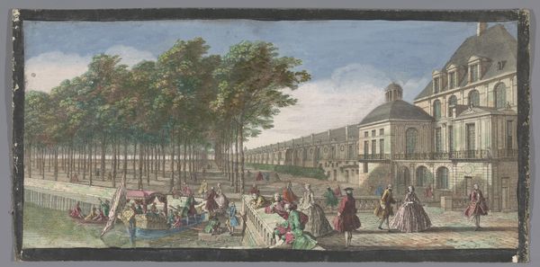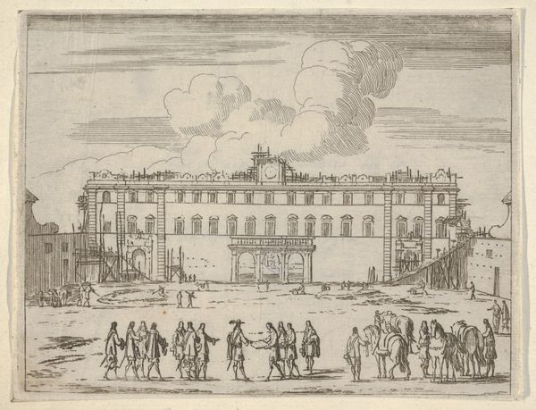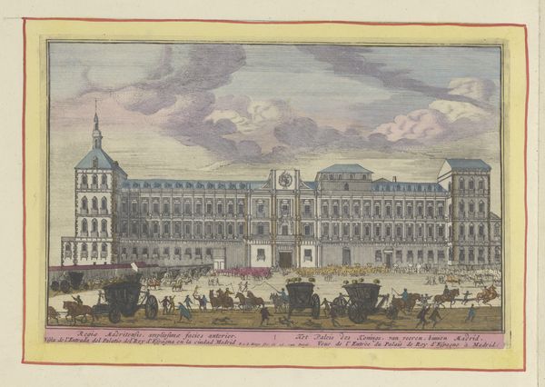 Pieter van den Berge created this print of the Palace of Charles VI in Lisbon. Notice how the architectural mass of the palace dominates the composition. The palace is depicted with a rigid symmetry, its repetitive windows creating a grid-like pattern that suggests order and control. The receding perspective draws our eyes towards the background where ships float serenely, contrasting with the pomp and circumstance of the royal court in the foreground. This deliberate arrangement invites us to consider how power is both displayed and constructed within the context of the European monarchies. Consider also the function of this print as part of a broader visual culture. It both reflects and reinforces ideas about sovereignty, authority, and spectacle. Its semiotic language speaks to the era's complex social and political structures.