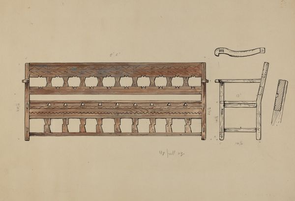 Editor: We’re looking at "Wooden Bench," a drawing made with ink, pencil, and watercolor sometime between 1935 and 1942. It’s got a somewhat sparse feel. What's your take on it? Curator: This piece, especially given its creation during the interwar period, resonates with questions of utility and accessibility. Mass production often sidelines traditional crafts, displacing artisans. What happens when furniture, something so integral to everyday life, is not merely functional, but also a form of resistance against homogeneity? Editor: Resistance? That's interesting! How so? Curator: Well, consider the hand-rendered details – the distinct character that mass-produced items lack. Isn't there a subtle statement in preserving craftsmanship? It makes you wonder, in a time of economic hardship, whether this reflects a deliberate return to self-sufficiency and local resources. Does the artist grapple with societal expectations or propose an alternative? Editor: That reframes my view. So, it's not just a bench, but potentially a statement on economics and the value of handcraft in a rapidly industrializing world. Curator: Exactly. Art often embodies silent narratives concerning societal values, individual identity, and communal resilience. By looking closely at material, design, and historical context, we begin to understand the potent stories even the most utilitarian object can tell. What has stood out to you in looking closely at the piece? Editor: I now see the importance of looking beyond the immediate aesthetic and considering the broader historical and cultural implications, how even a simple wooden bench can become a symbol of identity and resistance! Thanks, I learned so much!