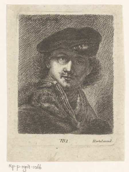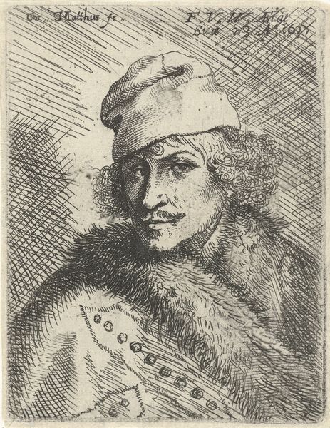 Curator: This is an etching, "Rembrandts selvportræt," a self-portrait by Rembrandt van Rijn, made around 1780. It is currently held at the SMK, the National Gallery of Denmark. Editor: My first impression is the incredible intensity of the gaze. Despite the rather modest scale of the print, it feels incredibly intimate and probing. The details within the etching creates almost tangible textures, and the lines making up the face create strong shadowing that make it pop out of the stark background. Curator: Yes, there's a compelling, somewhat melancholic presence, isn’t there? Consider the visual language. The way he employs hatching and cross-hatching to build up these tonal contrasts gives so much emotion to the portrait. It calls to mind ideas of his own personal reflections about being in his 70s and a self reflection of self as a historical memory. Editor: The way he situates himself—wrapped in what appears to be luxurious furs, almost theatrically posed—speaks to broader societal contexts, perhaps, commenting on the shifting roles of artists and the development of their individual identities within a developing capitalist, celebrity-driven society of that time? Even then, social positions and performances of the self were being meticulously crafted and communicated to audiences in ways that feel oddly contemporary. Curator: Precisely, an artist controlling and shaping his own image. The hat is a convention he repeats—it symbolizes the artist, a marker of selfhood, of the artist as an intellectual but in this case in more somber hues of blacks, whites and greys that perhaps denote someone a bit wiser. It emphasizes the cultural continuity of symbols, adapted and reinterpreted across different historical moments. Even in 1780! Editor: I am drawn to how we still continue to recycle art themes even up to this time period. I would also add that an etching from 1780—what does it mean to keep reproducing a 17th century artists portrait? I'd argue it speaks to art canon formation, the solidification of artistic genius, and how power structures embed themselves even in visual representation. Curator: It also invites further reflections. Even centuries later, its immediacy persists. Editor: Agreed. This intense immediacy encourages us to re-evaluate and connect to ourselves.