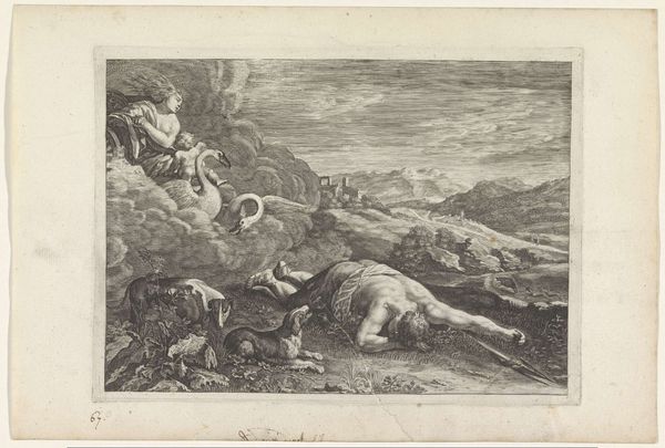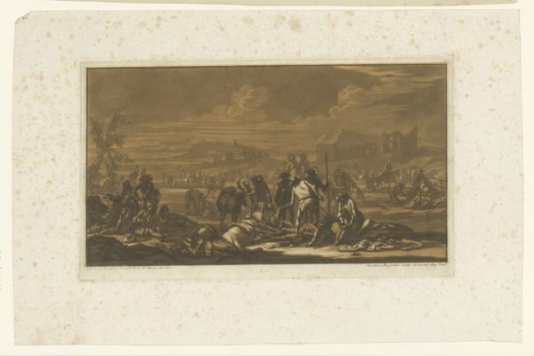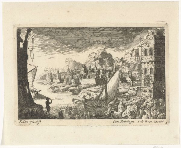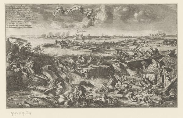 Editor: Okay, so here we have a print called "Schipbreuk van de Coromandel," made in 1676. It looks like an engraving, full of dramatic waves and tiny figures struggling in the water. It definitely conveys a sense of chaos and tragedy. What do you see in this piece? Curator: Chaos indeed! This shipwreck jumps right out at me; imagine being tossed about like one of those little figures. For me, it's as if the artist wanted to express our vulnerability against the grander theatre of nature, not in the quiet beauty of a serene landscape, but in a violent, almost theatrical maelstrom. Does the composition make you think of the Baroque era at all? All of this… movement? Editor: Yeah, now that you mention it, I can definitely see that. I guess all the diagonals, and the way everything's kind of swirling around...But, what does the event depicted in this print mean to you? Curator: Well, remember that 17th-century prints like these weren't just pretty pictures. They served a journalistic purpose. Consider the sheer number of people involved! It also prompts me to reflect on our constant battle against the overwhelming forces around us. The smallness of those figures bobbing about is rather heartbreaking; can we not learn from the past? What feelings does the depiction invoke in you? Editor: Definitely a feeling of helplessness, like you said. It’s easy to forget the human cost when we read about historical events, but this really brings it home. It’s also a reminder that nature is, well, scary! Curator: Exactly. And it’s amazing how a simple engraving, hundreds of years old, can still provoke such a visceral reaction. Gives you something to think about, doesn't it? Editor: Totally. It makes you look at the news differently. I never thought about prints being journalism either, it feels like I am looking with new eyes. Thanks for opening my mind!
