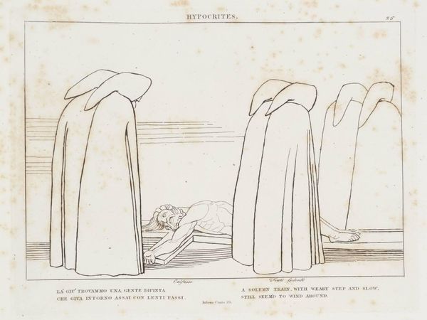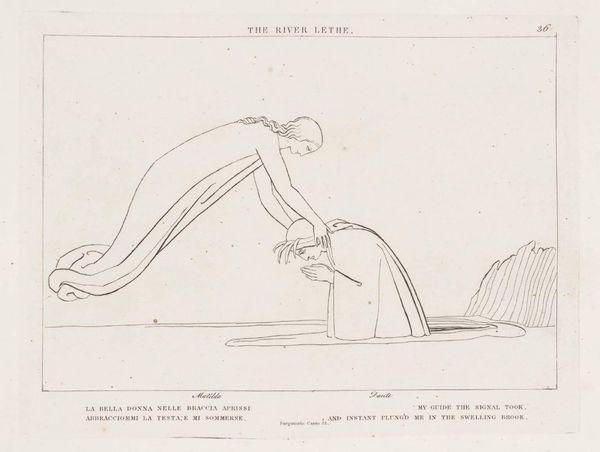 Curator: This is John Flaxman’s "Forese’s Elevation," a delicate engraving that entered the Tate collection. There’s a striking ethereal quality to it. Editor: Indeed. The stark lines and minimal shading lend a sense of purity, but also of labor—the deliberate act of carving those lines into the metal plate to produce this image. Curator: The figures, caught between earthly constraints and divine ascension, really speak to the potent symbolism of Dante’s journey through purgatory, a tale of spiritual purification. Editor: It’s fascinating how Flaxman relies solely on line to convey such complex ideas about morality and redemption. Think of the production—metal, ink, paper—common materials to convey lofty themes. Curator: Flaxman really captures the emotional weight of striving for a higher state of being. Editor: And it’s through readily available materials, transformed by human labor. A powerful thought to leave us with.
