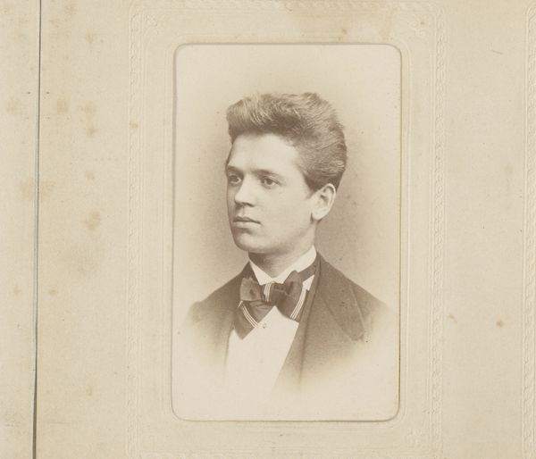 Curator: Looking at this fellow—so serious, so sepia. Makes you wonder about lost worlds, doesn’t it? Editor: Precisely. The muted tones lend this “Portret van een onbekende jongeman,” dating anywhere from 1859 to 1898 and credited to George Lodewijk Mulder, a pensive aura. It seems frozen in time. Tell me what first captures your attention? Curator: His eyes. They don’t meet yours directly, right? There’s a slight avoidance, a touch of melancholy perhaps. The image quality enhances that mood of introspection, like a soul caught mid-thought. Editor: I see a carefully constructed visual scheme—notice how the oval crop emphasizes the subject’s face, directing all attention there, supported by a central placement within the photographic frame. What might otherwise have become simply a representational portrait assumes something more studied in terms of classical composition. Curator: Could be. Or maybe he was just terribly shy. But you're right—that sharp focus certainly heightens everything. Makes the smooth planes of his cheek stand out more. There's something appealingly romantic about old photos. I always think: Who loved them? Who held onto them through thick and thin? It gives one a funny sensation. Editor: I agree that that is an intriguing prospect for us to consider. It leads us to see how it goes beyond mere identification; how each mark suggests complex layers of being; and why each layer is part of both the surface we see—and something much more elusive beneath. This work speaks so eloquently from the space between silence and documentation, doesn’t it? Curator: Totally. There's so much unsaid history captured within its simple frame, waiting to unfurl. Editor: Indeed. A moment perfectly, subtly encapsulated in its unique presentation.