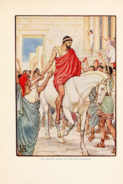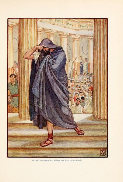 Editor: Walter Crane's "Often she would stand upon the walls of Troy" rendered in watercolor and colored pencil... There's such a melancholy atmosphere. She seems very alone and trapped within that golden cage of armor and that tower. What do you make of it? Curator: The repetition of the gold--in her bracelets, helmet, the peacock fan—draws the eye, doesn't it? Gold as a symbol of wealth and status is obvious, but also consider its connection to the sun, to the divine, even to corruption. Does that elaborate peacock fan feel empowering or suffocating, especially considered alongside the weaponry? Editor: Suffocating, I think. The fan looks so heavy, almost like another piece of armor. So is Crane contrasting luxury with the grim reality of war? Curator: Perhaps. Note the averted gazes. She doesn't engage, not with us, not with the figures behind her. Consider also the shield. The griffin is a powerful mythological symbol: guardian, courage, strength, yet it lies unused. Is it a lament for lost power, the abandoning of traditional roles? Does she, with her back to them, signify the end of an era? Editor: So, we're seeing symbols of both power and helplessness. I see how they work together to create that atmosphere of trapped melancholy I sensed initially. Curator: And melancholy can be a powerful cultural memory in itself, can't it? It lingers in the artistic rendering. It's a potent emotional and intellectual concept when we see the classical world represented this way. Editor: It gives you so much to think about – beyond just a surface reading. Thank you! Curator: My pleasure, indeed symbols are meant to provoke us and engage with deep-seated psychological and cultural realities.