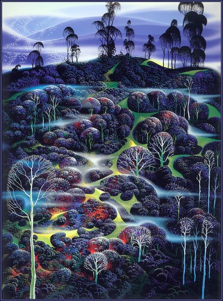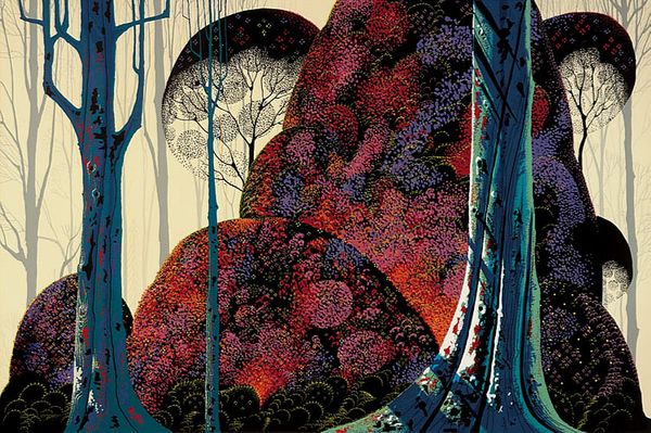 Eyvind Earle made this painting, Early Autumn, using a silkscreen technique. This image shows a hyper-stylized forest, a place of idealized natural beauty divorced from any specific geographical location. Earle’s commercial work for Walt Disney Studios might be relevant here, as it evokes the unreal, artificial landscapes of animated film. The highly controlled use of color and geometric forms—the near-perfect spheres of the trees, for example—makes this less a scene taken from life than a constructed fantasy. This print was made at a moment when anxieties about environmental degradation were becoming increasingly urgent, in the decades after World War II. It can be understood, perhaps, as a nostalgic vision of an unspoiled landscape, untouched by industry or other forms of social and economic development. To better understand this artwork, it would be useful to look at other examples of landscape painting made at the time, and to consider how ideas of environmentalism influenced American art and culture in the postwar era.