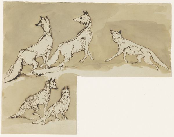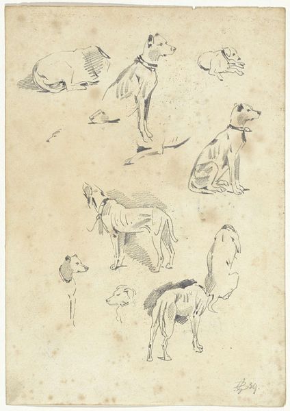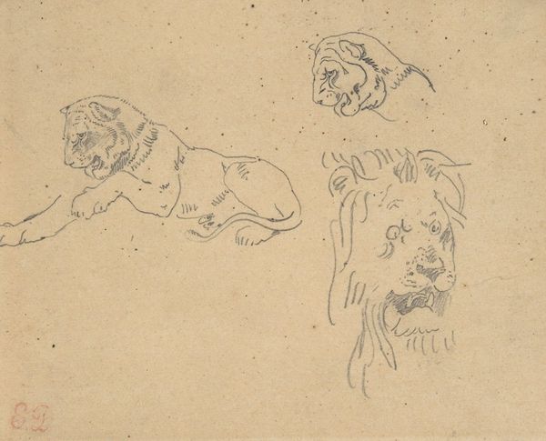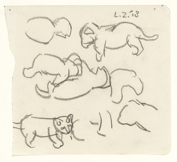 Editor: This is "Studies van leeuwen" by Carel Adolph Lion Cachet, dating sometime between 1874 and 1945. It's a pencil drawing held at the Rijksmuseum, depicting multiple lions in various poses. I’m really drawn to the simplicity of the line work. What stands out to you about this piece? Curator: The rapid pencil lines suggest this was likely a sketchbook study, perhaps done from life at a zoo. Given Cachet’s life and travels, it raises interesting questions about the cultural context. Were these sketches preparation for a larger, more politically charged work? Think about the lion as a symbol of colonial power. How does that complicate the way we view these seemingly innocent animal studies? Editor: That’s a compelling angle. I was mainly focusing on the artist's skill in capturing the animal's form and movement. I hadn’t considered the socio-political implications of the lion as a symbol. Curator: It’s easy to get lost in the pure aesthetics, but art always exists within a social framework. Cachet's dates places his artistic development within periods of immense societal change. Do you see anything in the way the lions are depicted - their posture, the apparent lack of a "kill" or struggle, for example, that can provide insight into art production of his time? Editor: Now that you mention it, their calm demeanor contrasts with the fierce image we often associate with lions. They almost seem domesticated, less symbols of raw power, more like trophies. Curator: Exactly. That shift, that framing of nature through a particular lens, reflects the changing power dynamics and how those ideals influenced public perception through art. It goes from being a scary image of something "out there," to a demonstration and public display of the artists' power and control. Editor: This makes me think differently about the role artists play in shaping our understanding of the world around us. Thank you. Curator: My pleasure. It's precisely those historical connections that give seemingly simple studies like this a much deeper resonance.
