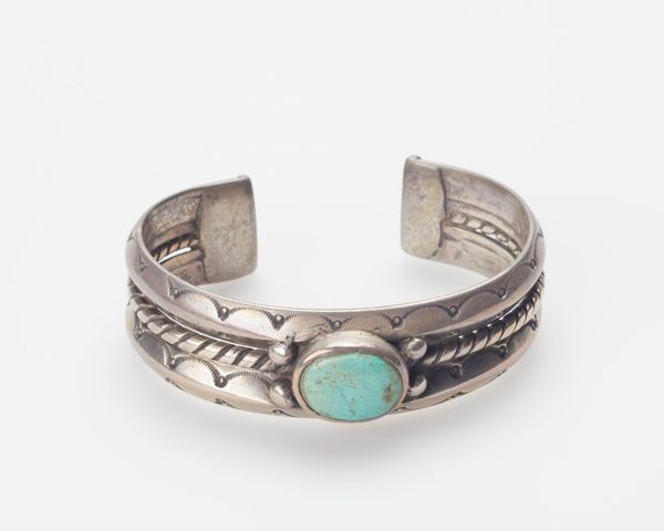 This bracelet, crafted by the Navajo (Diné) people, presents a compelling interplay between the cool sheen of silver and the vibrant turquoise stones. The metal's malleable quality allows for fluid lines and intricate detailing, forming the bracelet's structure. Notice how the composition emphasizes a central motif flanked by symmetrical turquoise embellishments. These stones, with their varied matrix and distinct cuts, inject a sense of organic vitality into the otherwise rigid metallic form. The bracelet's design reflects a broader artistic dialogue concerning nature and culture. The turquoise, often associated with healing and protection, contrasts with the structural formality of the silverwork. Consider how the bracelet's form both adorns and signifies. Its materiality and design invite continuous engagement, reflecting a complex interplay of cultural, aesthetic, and personal meanings. As such, the bracelet becomes a dynamic site for ongoing interpretation.