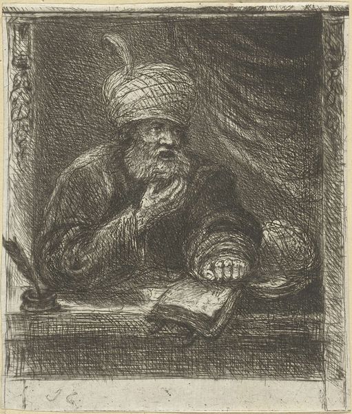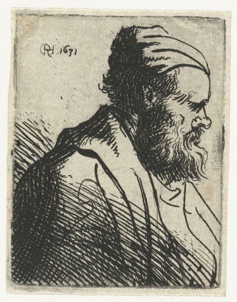 Curator: It's a moody little thing, isn't it? Brooding almost, despite its small scale. Editor: Indeed. We’re looking at "Man in cap bound around his chin," a drawing created by Rembrandt van Rijn around 1631. It currently resides in the collection of the Rijksmuseum. Executed in ink, it exemplifies the Baroque style with a distinct profile portrait. Curator: The material economy is so important. The availability of ink, the price of paper in Amsterdam in the 17th century - it's easy to forget these things when considering a great master, isn't it? But that material context shaped his labor. It's fascinating how Rembrandt democratized image-making. Prints allowed for wider dissemination of artworks. Editor: True. And his skillful use of line and shadow brings form into being with great economy. Observe the hatching. The way simple lines build a sculptural impression, defining planes of the face and drapery. Semiotics teaches us that even a minimal set of visual cues can conjure a robust, convincing image in the eye of the beholder. Curator: The subject’s headgear also presents interesting possibilities for material interpretations. Was it Rembrandt's own turban? Was this exoticized, imported fabric widely available through trade in the ports of Amsterdam? This helps reveal cultural exchange between Dutch artisans and trade routes throughout the globe at this time. Editor: Very compelling considerations. Shifting our focus slightly, the profile captures something profoundly human, perhaps melancholy or contemplative. Rembrandt's technique elevates mere ink and paper to reveal nuanced aspects of personality. Curator: Ultimately, for me, Rembrandt reveals to us the interconnectedness of material realities and artistic production. It’s never just the artistic genius, it's the social and economic context in which artistic activity takes place that allows certain masters to be known. Editor: A wonderful reminder. By looking deeply into structure, the piece invites meditation. Even a small ink drawing has much to tell us about composition, form and feeling, and human creativity.