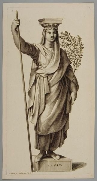 Editor: This is "Colony," an undated print by Gérard Audran, housed at the Harvard Art Museums. The figure is so striking, almost sculptural, and it's fascinating how the artist uses line and form. What stands out to you in this piece? Curator: The linear precision is notable. Consider how Audran constructs the figure through cross-hatching and varied line weights, creating depth and volume. The capital on her head and the strange tool are particularly interesting formal elements. What do you make of their placement? Editor: They feel balanced, like counterweights in a composition, yet also a bit unsettling. I see a tension between classical form and unusual attributes. Curator: Precisely. The interplay between the familiar and the unconventional is where the work generates interest, challenging our expectations of allegorical representation through purely formal means. Editor: It's like the artist is using classical elements to deconstruct classical ideals. Thanks, I learned so much. Curator: Indeed. The artist's strategic manipulation of form provides a wealth of insight.
