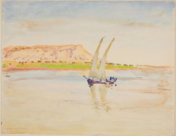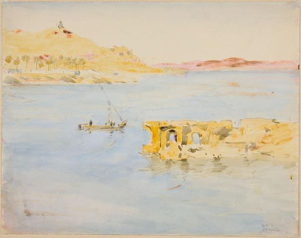 Editor: This watercolor is "Landscape, Assouan, Egypt" by Denman Waldo Ross. The scene feels serene, almost dreamlike. What can you tell me about it? Curator: This work invites us to consider the legacy of Orientalism. How might Ross, as a Western artist, have shaped his perception of Egypt through a colonial lens? Editor: So, the beauty I see is filtered? Curator: Precisely. Think about who is represented and who is not. What narratives are amplified, and which are silenced? Editor: It’s made me rethink my initial response. Curator: It's about questioning our own gaze and understanding art's role in shaping cultural perceptions.