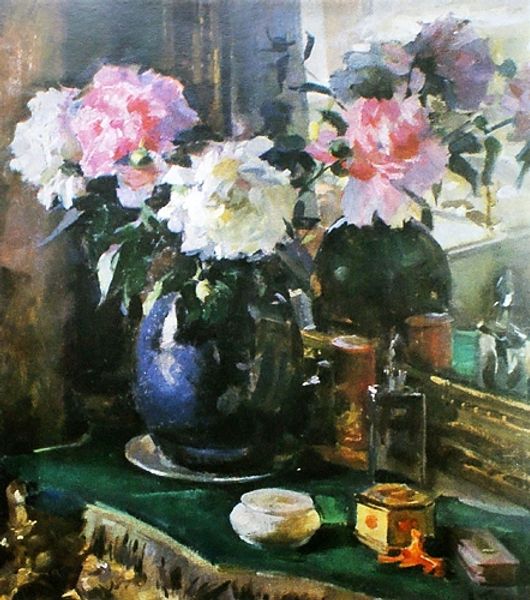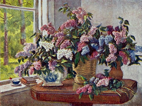 Pyotr Konchalovsky's 'Still Life. Peonies at the window' is a painting seemingly made with pure joy, capturing a scene of cut flowers in front of a window. The process here is all about building up layers of color and texture to create a rich, almost tactile surface. Looking closely, you can see how the brushstrokes themselves become part of the image, especially in the petals of the peonies, where thick daubs of paint suggest form and shadow. The color palette is mostly pinks and greens, but there are touches of blue and purple that add depth. The paint is applied so thickly in places that the surface of the canvas is almost sculptural. Notice the way Konchalovsky renders the light filtering through the window, using contrasting tones to create a sense of atmosphere. Konchalovsky reminds me of the Fauvist painter Maurice de Vlaminck in the way he fearlessly combines colors and textures. This painting isn't just a representation of a still life; it's a celebration of the act of painting itself. It's a reminder that art is an ongoing conversation, an exchange of ideas across time.