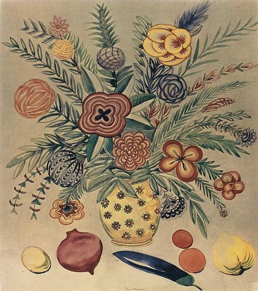 Editor: This is Frida Kahlo's "The Bride Frightened at Seeing Life Opened," painted in 1943. It's an oil on canvas, and it feels so vibrant and alive with all this fruit. What do you see in this piece? Curator: I see a study in materiality, Editor. Kahlo has rendered these fruits with such detail, emphasizing their textures and forms—the sharp spikes of the pineapple, the soft flesh of the watermelon, the fuzzy skin of the coconut. This meticulous attention to the physical substance of her subject matter grounds the work, moving beyond mere representation to a tactile experience. Even the doll, with its porcelain sheen, is a material object. How does this focus on the tangible resonate with you? Editor: It makes me think about how we consume these things, both visually and literally. The abundance is striking, yet there's a doll and an owl, which feel less natural. It’s a very deliberate arrangement. Curator: Precisely. The arrangement itself is a product of labor, a conscious act of composition. Kahlo is not simply depicting nature; she is re-presenting it through the materials and techniques at her disposal. The owl, often associated with wisdom or ill omen, and the doll, a symbol of idealized femininity, are placed within this bounty, inviting us to consider their material presence alongside the organic forms. What does this juxtaposition suggest to you about the artist’s intent in assembling these elements? Editor: It’s unsettling, isn't it? The sweetness of the fruit contrasted with the potential symbolism of the other figures. It makes me consider what’s truly being offered or consumed. Curator: Indeed. The act of painting these objects, the very process of applying pigment to canvas, becomes a commentary on creation and perception. We are invited to dissect not just the depicted objects but also the artist's process of making and the viewer's process of seeing. It’s a rich interplay of material reality and symbolic meaning. Editor: That’s a fascinating way to look at it. I hadn't considered the labor of painting so deeply. It makes the artwork feel even more substantial. Curator: And that, Editor, is the power of truly engaging with the material world of art.