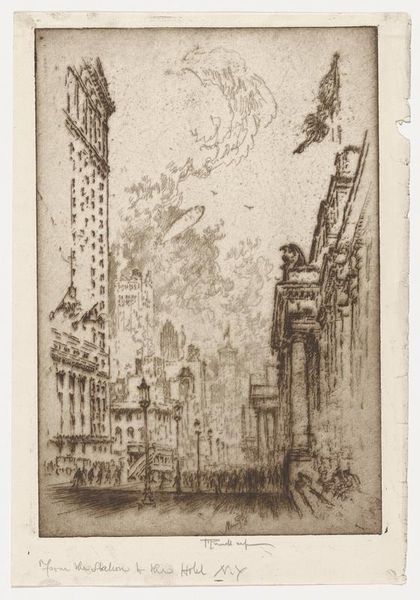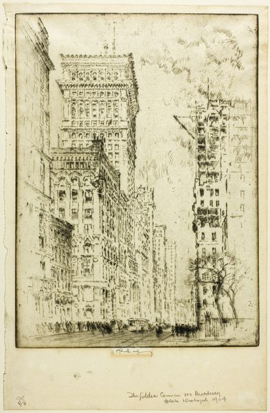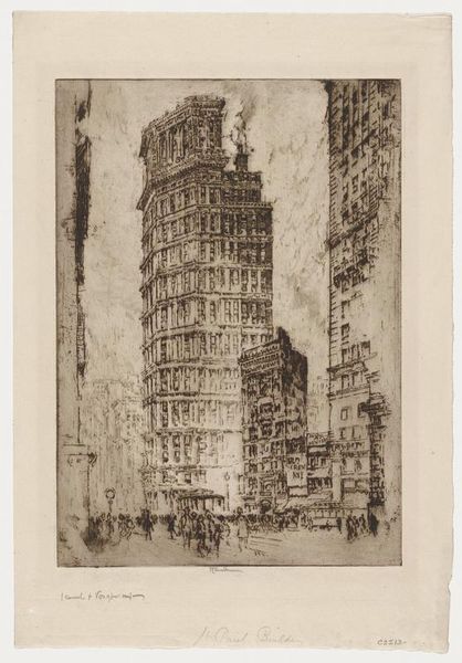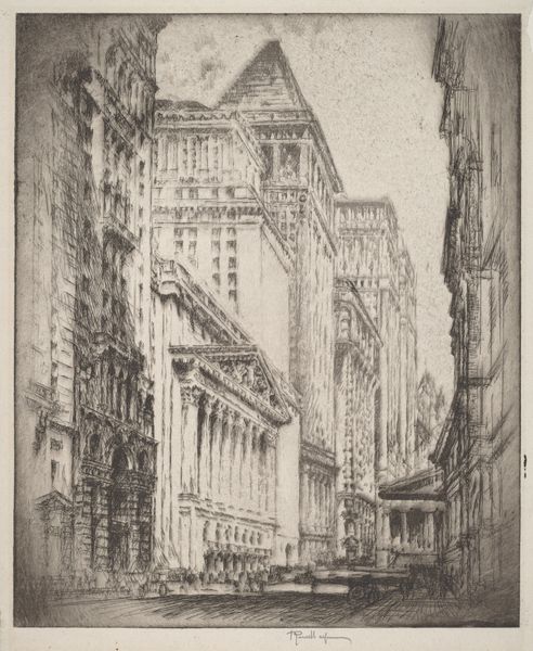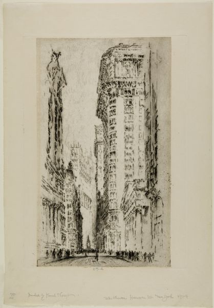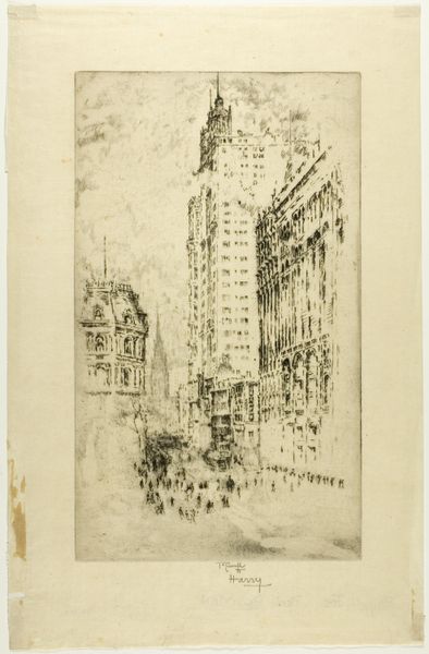 Curator: This etching, titled "Queen Anne's Mansions," was created by Joseph Pennell in 1903. It's part of the collection here at the Minneapolis Institute of Art. What strikes you first about this print? Editor: The atmospheric density. The stark buildings reach toward a hazy sky rendered in tight, energetic lines. The buildings look imposing. Curator: Pennell was quite taken with urban scenes. He felt that modern cities reflected the dynamism of the modern age. Queen Anne's Mansions, when it was completed in the 1880s, was one of the tallest residential buildings in London. Editor: I can see that—the lines almost vibrate with a sense of movement and verticality. Notice the strategic use of light and shadow to emphasize the buildings' structures, creating depth within a limited tonal range. The use of light in this print creates a hierarchy among shapes and emphasizes the grand scale of buildings. Curator: This print captures a period when London was undergoing massive changes. The introduction of taller buildings—enabled by advancements in steel construction—started to reshape the city’s skyline. Artists of this era became interested in depicting how people and cities change together. Editor: Look at the texture achieved through the etching technique—it gives a rough quality that emphasizes both the physical and fleeting presence of smoke and clouds as key figures within the composition, not just merely a backdrop to the architecture. Curator: It's worth noting Pennell’s role as an advocate for printmaking as a fine art during this period. Prints could be distributed widely and often served as visual commentary on modern life. Editor: Definitely. Considering the dense patterns of light, shadow and texture—Pennell not only captured a specific place but a fleeting visual experience as well. The eye is not simply viewing a cityscape, but actively discovering it within the lines of a city street. Curator: Well, it's fascinating how Pennell used this medium to encapsulate a pivotal moment in London’s architectural history. Editor: Yes, and his attention to details—from the architectural to the atmospheric—renders an ordinary street into a visual delight.