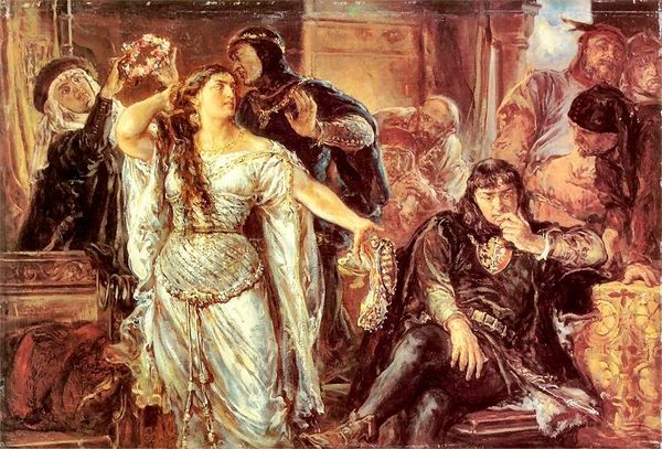 Jan Matejko painted "Entry Valois" portraying a historical scene marked by the arrival of French royalty. The visual elements are dominated by the figure of a rider on a horse, a symbol of power and authority that dates back to antiquity. The horse, rearing up, is reminiscent of equestrian statues meant to convey dominance. We see this motif recurring through time, from Roman emperors to Renaissance rulers, each epoch imbuing it with its own nuances of meaning. The canopy held aloft, another symbol of status, reminds us of similar structures in religious processions, transforming the king’s entry into a sacred event. The collective memory associated with such displays creates an emotional charge, and the artist taps into this. The very act of painting historical events like this serves as a form of cultural preservation. Just as motifs evolve, so too does our understanding of the past, and how it haunts the present.