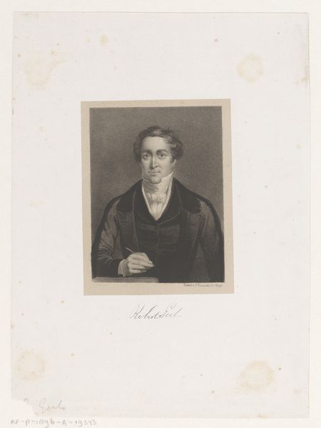 Curator: The somber mood created by this engraving immediately catches my eye. Editor: Indeed. We're looking at the "Portrait of Robert Graves, Printseller," dating back to 1827, presently housed here at the Metropolitan Museum of Art. It offers an interesting lens into the printmaking trade of that period. Curator: What's particularly compelling is the medium itself—an engraving. Each line, etched with intention, reveals a meticulous and labor-intensive process. You can almost feel the artisan’s hand at work. What was printmaking’s social role during this time? Editor: Printmaking held immense power. It democratized art, allowing imagery to circulate widely through society, shaping public opinion and recording cultural and historical moments. Graves, as a printseller, stood at the center of this network, controlling access to images. The negative space is quite strong. Curator: That distribution aspect is essential, influencing both aesthetic tastes and what kind of imagery consumers purchased. It begs the question: Who controlled those printing workshops, and who was buying the prints? I wonder what class backgrounds and access determined what he prints and ultimately, sells. Editor: A key element for contextualization is that Graves isn’t just any figure; he’s Robert Graves, an important figure in the printing trade during this Romantic period. He's holding an example of a bank note there too. He contributed to establishing new printing techniques that expanded distribution in England. Curator: Notice the exquisite detail in rendering his clothing. The subtle sheen on the fabric of his coat, achieved solely through meticulously placed lines, is extraordinary. You see it, then also recognize that there's some clever deception happening too in that act of mechanical reproduction. Editor: I see it as more representational. These portraits affirmed identity and social standing in a rapidly changing world. Displayed in homes or studios, engravings like this broadcasted Graves' prominence to contemporaries and influence in visual and economic cultures. It's really that act of displaying taste, that seems like a romantic expression in art, really solidifying the medium's influence and importance as a popular technology of display. Curator: In the end, thinking through how images move through society helps contextualize not only what gets made, but by whom, and with what consequence to image economy. Editor: Seeing the work itself, even a portrait of someone as central to production reminds me that all images are products of labor but always stand within society.