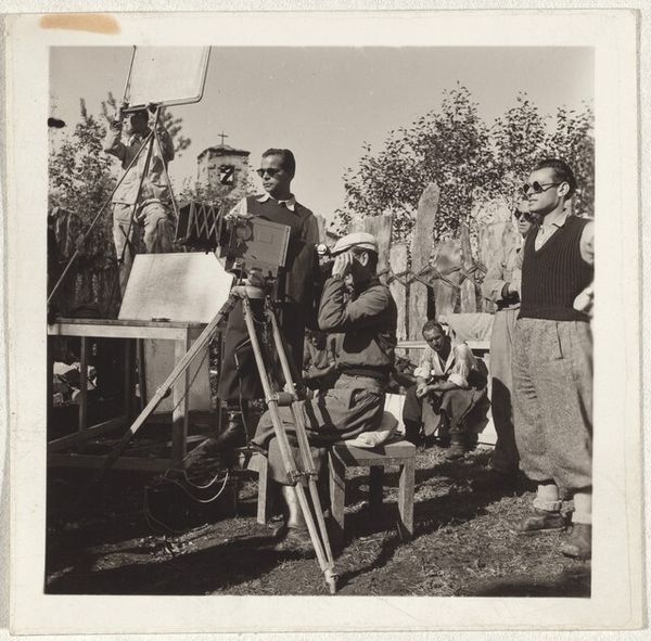 Curator: Robert Frank’s gelatin-silver print, "Behind scenes--Filming 'Landammann Stauffacher'", produced in 1941, presents a captivating glimpse into a film production. The initial impression is one of ordered chaos; ladders, cameras, and numerous figures populate a landscape, giving it a layered effect. Editor: It's quite striking how the equipment, like the ladder and bulky camera, seem to dominate the actors on set. You can almost feel the weight of the technology, and the labor required to operate it. Curator: Absolutely. Looking at this image through a lens of identity and context, we might consider the cultural impact of such films, particularly during the wartime era in Switzerland. "Landammann Stauffacher" touches on Swiss history and myth. The 'behind the scenes' aspect complicates the final heroic narrative often depicted. Editor: Indeed. And notice how Frank captures not the final polished image of the film, but the actual process, the means of its production. The bulky camera itself, along with the lighting reflectors, become key elements within the composition; reminding us of all the tools and people it takes to tell this myth. Curator: By documenting the making of the film, Frank also offers commentary on constructing national identity and propaganda at the time. We see the artifice. It raises questions about whose stories are being told and by whom, especially in a period of such political tension. The social dynamics between the filmmakers, crew and film content must be parsed out to see its role. Editor: The monochrome adds another layer, flattening the hierarchy between the players. Everyone is united in getting this task done, regardless of race, gender, or other characteristics; as such these nuances of identity disappear and come into the communal task. And the gelatin-silver printing enhances the textured materiality; reminding the viewer this isn’t just a captured scene, it’s also a crafted object, a representation in itself. Curator: I agree, its textural quality adds to this photographic account and highlights a different perspective on art during a complicated political period, and I wonder how modern cinematic practices can learn from these behind-the-scenes portrayals. Editor: I hadn’t considered the parallels to modern cinematic practices like that before; viewing this I really can appreciate the image's depth from production and identity-construction viewpoints.