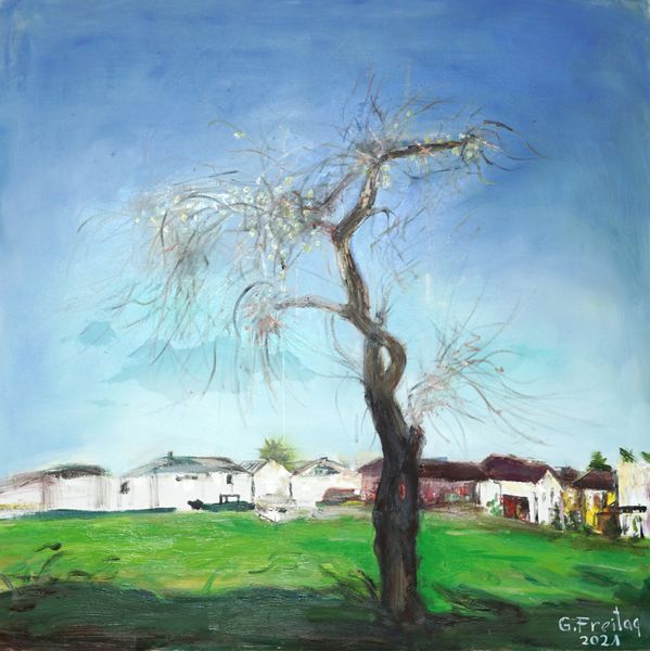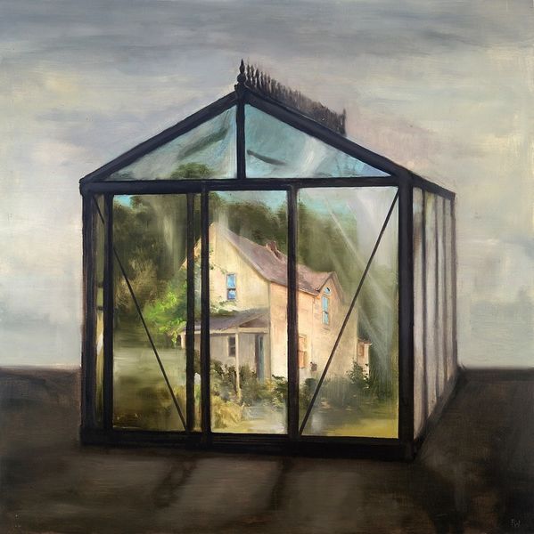 Stefan Caltia’s ‘Cross on the Shed’ feels like a dream, painted with a tender hand and a folk sensibility. The whole scene is bathed in this hushed light, a gray sky hanging over a simple blue shed, and the cross, like a ghostly echo, right there on the side. It's the texture that grabs me; the way the paint sits on the surface feels almost powdery, especially in the trees bursting with white blossoms. Looking at the trees, you can see how the hand moves. The blue of the shed is so simple, almost childlike in its flatness, which contrasts with the meticulous dabs of white that make up the foliage. It’s as if Caltia is reminding us of the quiet dignity in the everyday. It makes me think of Agnes Martin and her soft, subtle grids, a similar sense of stillness and contemplation. Art is a conversation and here Caltia quietly reminds us of the sacred in the ordinary.
