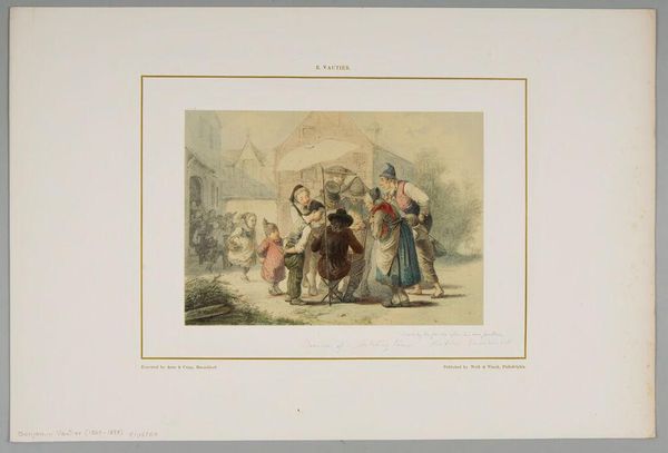 Editor: This print, "The Toy Merchant" by Arnz & Co., shows a crowd of people clamoring around a figure with a tree over his shoulder. It's a lively scene, almost chaotic. What strikes you about the imagery at play here? Curator: Note how the figures reach for the toy merchant. They aren't just reaching for toys; they are reaching for the very symbols of joy, promise, and perhaps even a brief escape from hardship. Does this image remind you of similar scenes of commerce and hope from other eras? Editor: I hadn't considered that. It makes me think about Black Friday! Curator: Precisely! The enduring human desire for connection, for celebration, and for a moment of light in the midst of the ordinary, all captured in a single, bustling image. Editor: It's fascinating how a simple scene can hold such complex emotions. Curator: Indeed. Art often reflects our shared humanity.