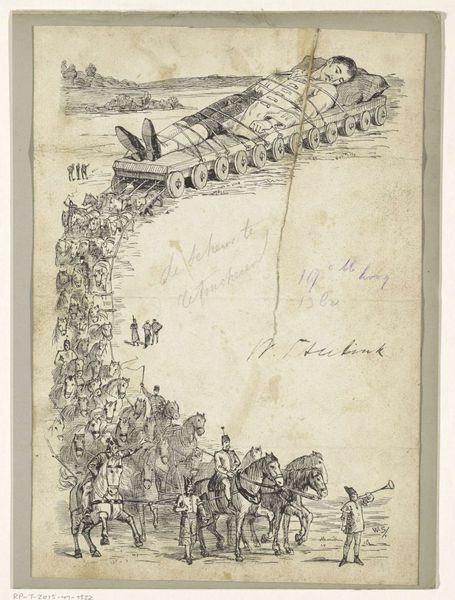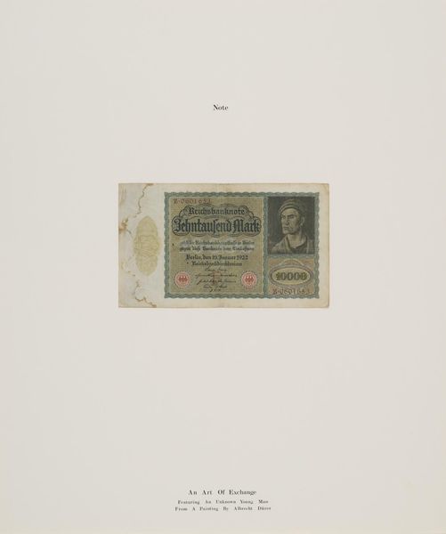 Curator: Cildo Meireles' work, "Insertions into Ideological Circuits 2: Banknote Project", invites a curious interaction. He used actual banknotes, in this case, it looks like a 100 Cruzeiros bill from Brazil. Editor: The visual is arresting; the overprinting of soldiers feels both aggressive and vulnerable. It makes you wonder about the stories this particular bill carries. Curator: Indeed, Meireles encouraged people to stamp messages onto banknotes and re-circulate them. He aimed to transform money, a symbol of power, into a vector for free speech under authoritarian regimes. Editor: The very act of defacing currency is charged with rebellious energy. It is an act of defiance and courage, literally injecting ideas into the stream of commerce. Curator: Absolutely. It's a poignant reminder that art can exist within, and disrupt, the everyday. This work turns a simple transaction into a political act. Editor: It's left me thinking about the power of quiet subversion and how even small acts can ripple outwards. Food for thought.