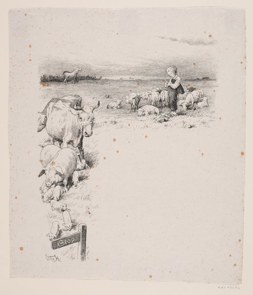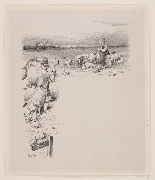 This is F. Hendriksen’s pen and ink illustration for "Flinchs Almanak". The composition is bisected into a rectangular upper zone and a vertical shaft, creating a stark contrast between surface and depth. The upper register presents a narrative scene on a flat plane. There is a grieving woman, a corpse and sparse, arid landscape. The illustration's depth is created by the shaft. The shaft is densely worked with cross-hatching, pulling us into the earth. There, a skeletal figure ascends using ropes. The artist presents us with a literal depiction of the underworld. The illustration subverts traditional notions of pictorial space by eschewing traditional perspective. It invites us to consider how meaning is constructed through juxtaposed spaces and symbolic forms. Hendriksen challenges the viewer to decipher the relationship between the realms of mortality and the spectral, questioning where meaning resides in the face of death.