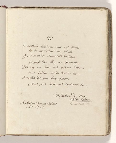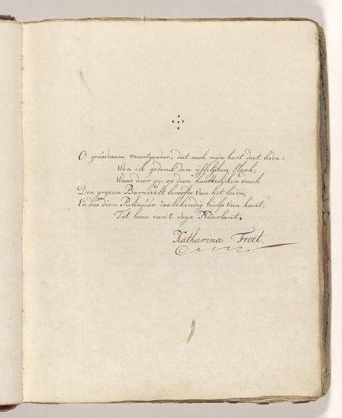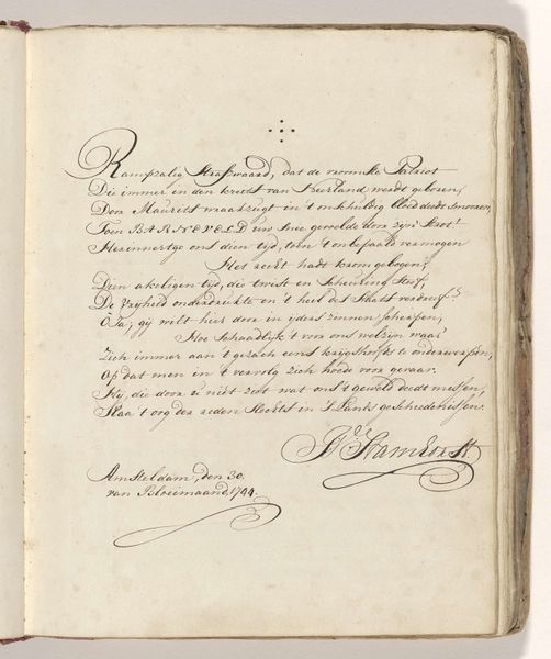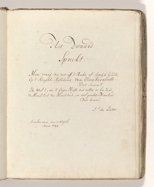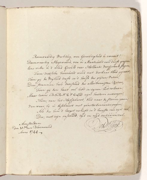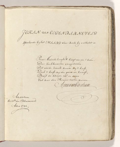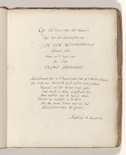 This is "Poem on the sword with which Johan van Oldenbarnevelt was allegedly beheaded in 1619" by Jacob Elias Michielsz, made in 1744. The poem is written in Dutch on a page, and it commemorates a controversial figure. Oldenbarnevelt was a leading statesman in the Dutch Republic who was executed for treason in 1619, amid religious and political tensions. Michielsz's poem engages with the conflicted memory of Oldenbarnevelt, who even after his death was seen as a martyr for republican ideals. The poem reflects a cultural narrative where Oldenbarnevelt is seen as a patriot unjustly put to death. The text evokes strong emotions about justice, sacrifice, and national identity. Michielsz was active during a period when the Dutch Republic was reflecting on its past and its identity. "Poem on the sword..." is more than a historical reflection. It's an emotional and personal engagement with themes of justice, sacrifice, and national identity, which speaks to the enduring power of art to shape our understanding of history.