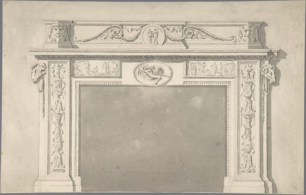 This drawing for a mantelpiece was rendered anonymously in ink and watercolor. The artist's tools were simple: pen, brush, and pigments on paper. Yet, observe how the material itself serves as a canvas for architectural imagination. The paper's surface, with its inherent limitations, guides the artist's hand, dictating the precision of lines and the subtlety of color washes. The ink, a humble medium, transforms into elaborate ornamentation. Consider the social context of the drawing. It likely served as a proposal, intended to impress a wealthy patron. The degree of detail reflects the value placed on skilled handwork and the desire for refined craftsmanship in interior design. We see here, on paper, the material culture of aristocratic life. Ultimately, this drawing invites us to appreciate the artistry inherent in the design process, challenging conventional boundaries between fine art and functional design.